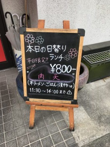 お店の前の看板にはランチがかかれていました。この日は肉天ランチのようです!なんの肉なのかな~となんとなく思いながら入店しました。