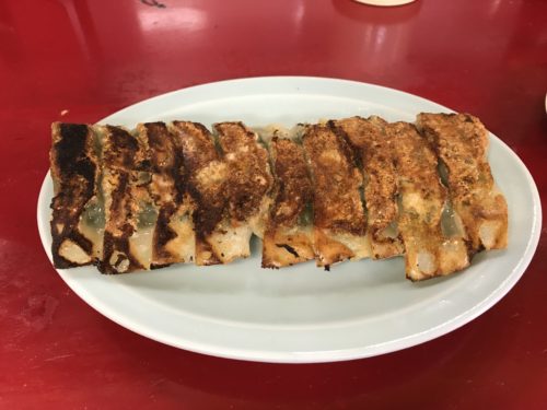 まずはそこへ餃子が登場しました~!おいしそうな餃子!いい香りがします!いただくとおいしい~!めちゃめちゃおいしい~!二人で一人前を頼んだのですが、足らずでもう一人前を追加したほどです!