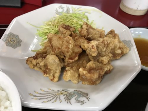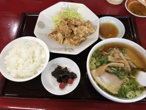 続いて肉天ランチが登場しました!ボリューム満点!ラーメンも半ラーメンといいながらもたっぷり入っていますよ!まずは肉天からいただきました~!これは豚肉かな?下味もちゃんとついていてとってもおいしい~!すばらしいですね!キャベツもおいしい!切り方が丁寧ですね~!