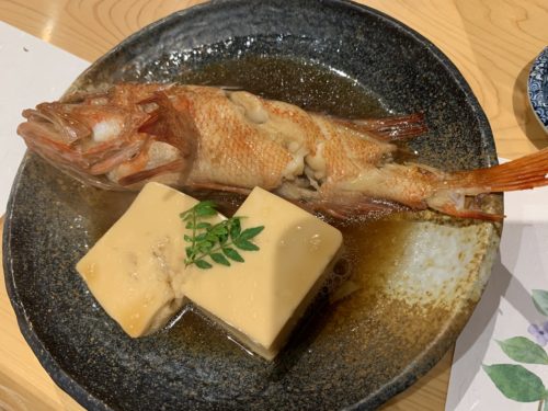 続いてキンキを煮つけでお願いしました!キンキがこんな値段でいただけるってすごいですね!お皿からはみ出るほどの十分な大きさでお豆腐もしっかりついてきましたよ~!味付けが優しくてとってもおいしい~!居酒屋さんのような濃い味付けではなくとっても食べやすい味付けになっています!めちゃめちゃおいしい~!