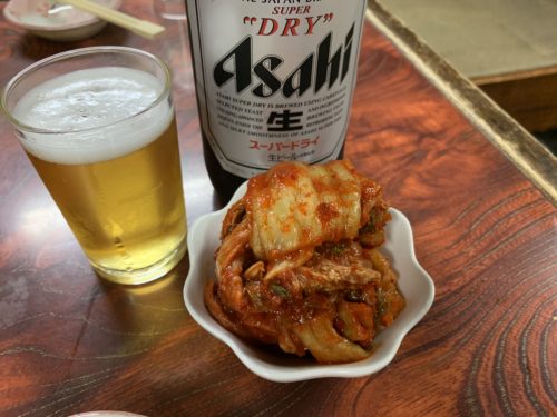 でもとっても美味しくて安くて素晴らしいお店なんですよね~!まずは瓶ビールで乾杯させていただきました!もちろん瓶ビールは大ビンです!昔ながらのお店は大ビンが多いですよね~!あてにキムチをお願いしました!キムチは大根と白菜が一緒に登場します!こちらのキムチもとってもおいしい~!キムチのお持ち帰りされる方も少なくないんですよ~!