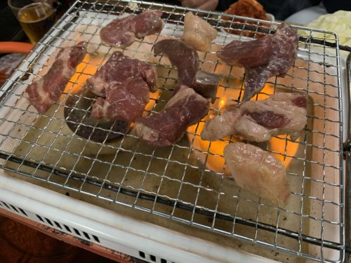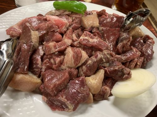 そこに待望のお肉が登場しました!メニューとしてはお肉くださいのみです。量は半分も選べるみたいですが私は持ち帰りでしか頼んだことがなかったのでそのまま通常の量が登場しました!めちゃ美味しそう!こちらは塩ダレなのですが、普通のタレもあるそうです。でも一度も頼んだことがありません。いろんな部位が入っていますがどれも本当に美味しいです。