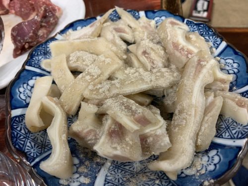 豚耳をお願いしてみました!この豚耳はすでにボイルしてあるので少し炙る程度でいいそうです。いただいてみると、これまた美味しい!お酒のあてに最高です!