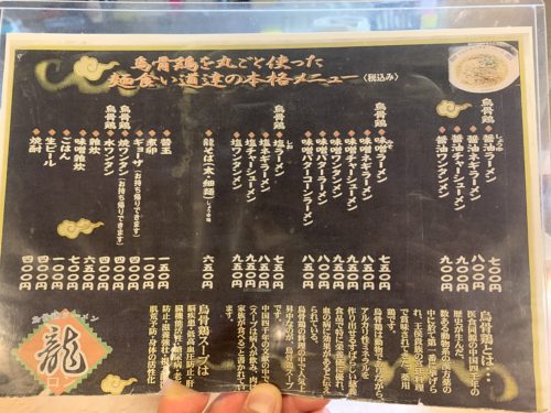 お店の名前は烏骨鶏ラーメン龍さんです。最初は烏骨鶏のラーメンと聞いて珍しいな~と思って通い始めましたが、お店の案内を見て飲みすぎた時通うようになりました。
