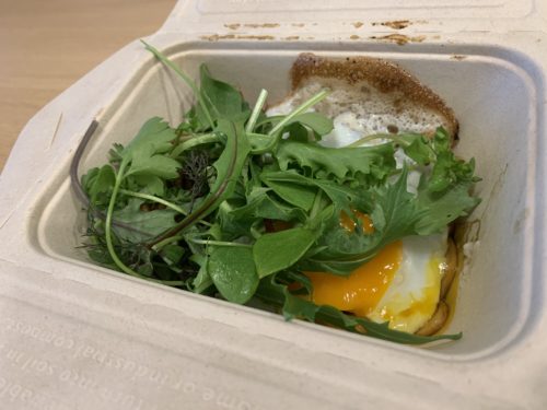 もう一つは太麺ソース焼きそば!箱をあけると、半熟目玉焼きとサラダがのっていました!