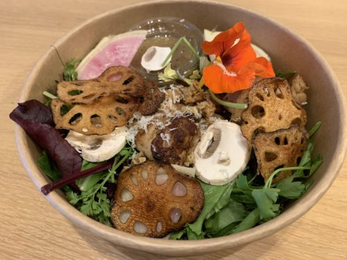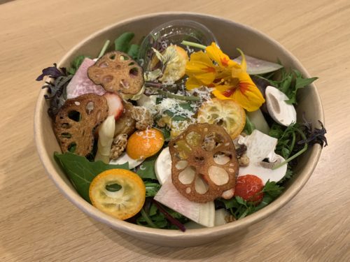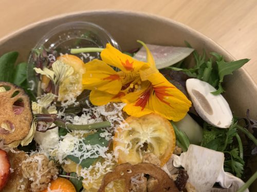 無事持ち帰ってまずはベジタブルサラダのふたをとってみると、、、どれもめちゃめちゃ美味しそう!こんなに美しいサラダありますか?食用のお花まで入っています。梶谷農園さんのハーブサラダと旬のお野菜を使っておられます。