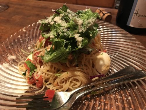 赤ワインをお願いしておいしくいただきながら、ふと見るとおいしそうな冷製パスタを作っていらっしゃったので私たちも食べたいな~とお願いすると作ってくださいました~!これがまたとってもおいしい~!最高です!
