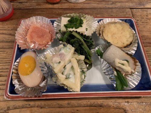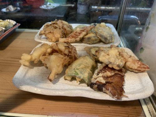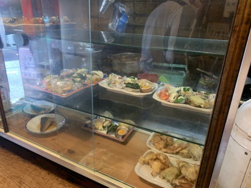 目の前のショーケースのおかずが美味しそうだったのでおでんは次回にまわすことに。中からおかずを一皿選んでいただきます。そのほかにサバの煮つけや天ぷら盛り合わせがありました!