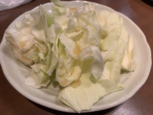待っている間にキャベツをいただきます!キャベツには特製のタレをかけていただきますよ~!このタレも美味しいんですよね~!たっぷりいただきます!