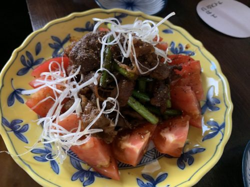 ありがたいですね~!しばらくするといい香りが店内に漂い始めました。ニンニクのいい香りが~!登場したのがニンニクの芽と牛肉とトマト!