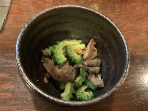 これは珍しい豚はつゴーヤ炒めを頂きました!ゴーヤと豚はつの塩加減が絶妙!歯ごたえもほどよいのでお酒にあいますね~!