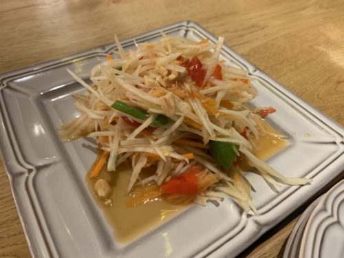 メニューをみながらどんなメニューがあるかな~と思っていると、なんとソムタムがあるじゃないですか!簡単に言うとパパイヤのサラダです!お願いしてみました!これ、なかなか日本では美味しいものに出会えないんです。