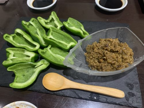 ピーマンカップ(呼び方が楽しい)にカレー風味の肉みそをたっぷりいれていただきました。めちゃめちゃ美味しい~!ピーマンの食感がとってもいい~!カレー肉みそがこれまた美味しい~!もう最高ですね!