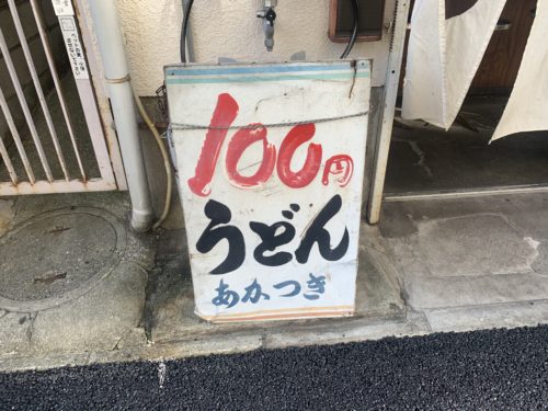 お店の前にあるこの「100円うどんあかつき」という看板は私はきっちり覚えているのであかつきにたまに連れていく友人なんかには、看板の書いてある順序覚えとるか~?ってクイズ出したりしちゃってます。笑