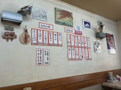お店に入るとお母さんが迎えてくださいました。メニューをみて肉玉そばイカ天をお願いすることに。