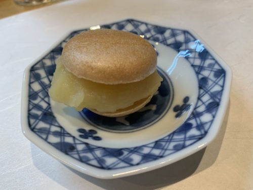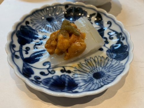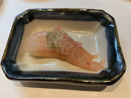 さて、尾前さんの続きです。北海道からお越しいただいた天然ぶりと北海つぶに舌鼓をうちながら次なるお料理をまっていると甘えびが登場しました!上にはフィンガーライムがのっています。こんなライムがあるんなんて最初に出会ったときはびっくりしたのを覚えています。いまでは結構目にするようになりましたが、やっぱり美味しいし面白いですね!