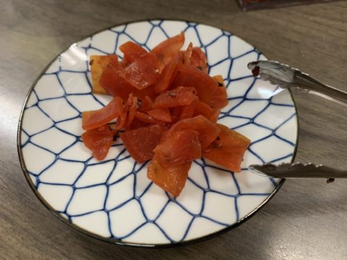 この日はまずは瓶ビールで乾杯しました!そして注文するまでの間、福神漬けをつまみます。笑