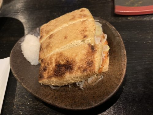 あい月さんの名物の一つ栃尾揚げが登場しました!新潟の名物なんだそうです。この日は味噌を選びました!油揚げの中に味噌とネギが入っています。いただいてみると、これまた美味しい~!最高!
