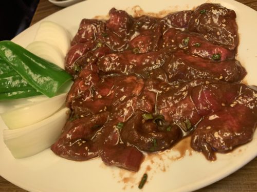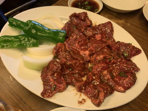 最初のお肉はカルビから!軽めに焼いていただきますよ~!もう素晴らしいおいしさ!飲んでなかったらいきなりライスと一緒にいきたいところですが、ぐっと我慢してお肉をがっつきました!