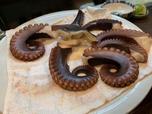 実はこの日は自分で釣ったタコを持ち込ませてもらいました。広島は三原で釣ったタコです。めちゃ有名なタコの産地ですね。きっちり処理してくださいました!