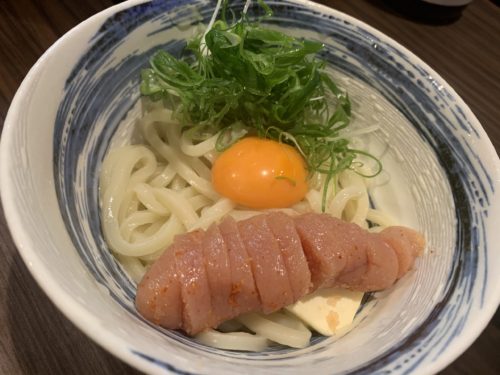 そして最後にいただくのは、一本さんに最初に訪れたときに初めて頼んだメニュー釜玉明太バターうどん!これ最強に美味しいです!明太子一本ついてきます。しっかり混ぜて最高に美味!