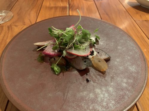 最初のお料理は炙りしめ鯖のフランボワーズ風味!しめサバにフランボワーズ?想像がつかなかったのですが、いただいてみると納得!酸味と甘みのバランスが抜群です!めっちゃめちゃ美味しい~!