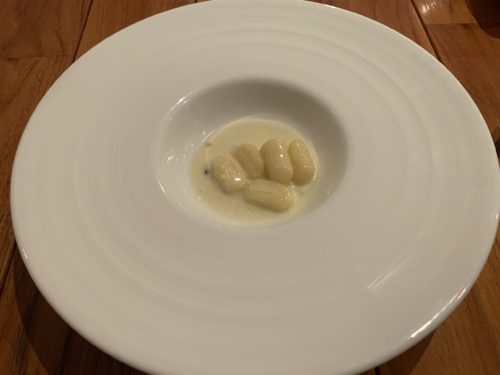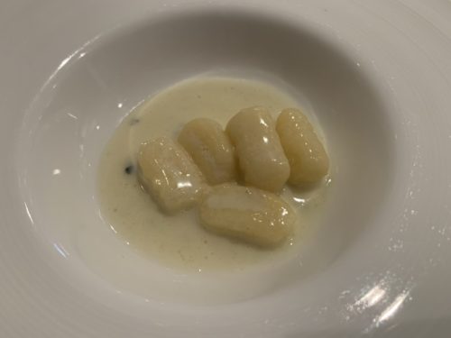 続いて大好物のニョッキが登場しました!じゃがいものニョッキですね!そこにイタリアチーズのソースが合わせてありました。このニョッキ、ものすごく食感がいい!最高に食感がいいです!