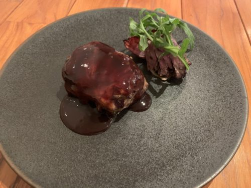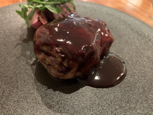 ここでメインが登場しました!広島が誇るジビエ、ジビエヨコタさんの猪肉をつかったパテを揚げ油に通してローストしてありました!ピスタチオと松の実も使っているそうです!赤ワインソースがいい香りしています。