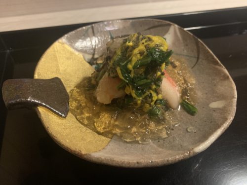 まずはビールで乾杯!今日はどんなお料理が味わえるのか楽しみにしながら待ちます。最初は蟹!蟹を菊菜と菊花ときのこのトンぶりであえてありました!さっぱり酸味の聞いたジュレととってもよくあいます!とっても美味しい~!トンぶりもきいていますね!