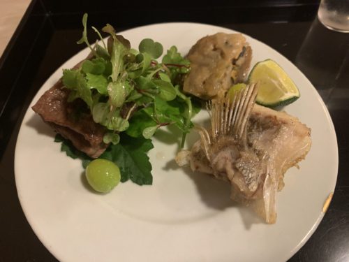 そして次の一皿がこれまたすごい!牛肉のすき焼き風マイクロリーフミックス、あけびのけんちん焼き、鯛の塩焼きでした。あけびのけんちん焼きは珍しいですよね~!めちゃめちゃ美味しい~!牛肉はいちぼの部分でした!お肉が甘い!