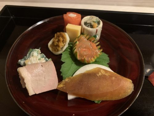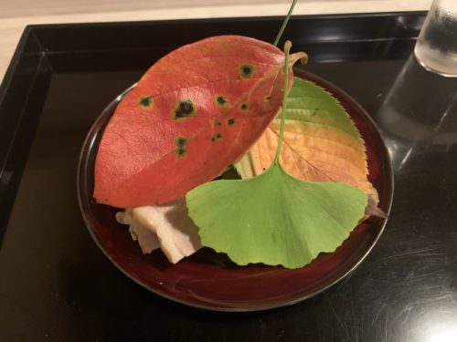 その葉のしたに隠れていたのは八寸!どれもがお酒を欲しがってしまう内容になっていました!イカの塩辛なんて本当に美味しいですよ~!