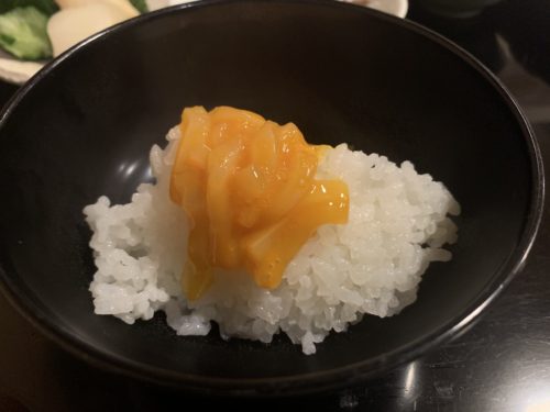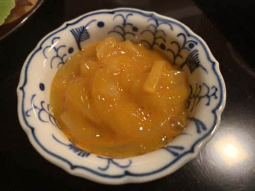 続いて登場したのは少しオレンジというか黄色というか、この色味はまず間違いなく美味しいです!なんだろうと思っていただいてみると、イカが入っていました!風味は、、なんだかウニのような、、、