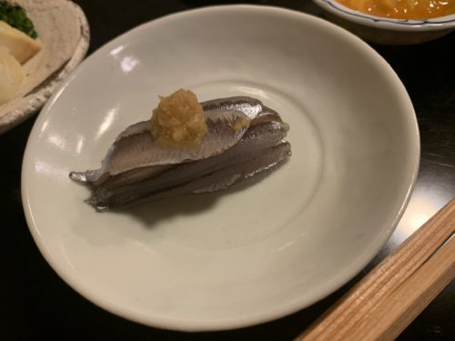 コイワシはここ最近よくだしてくださいます。このままいただくのが最近の楽しみですね!コイワシの本当の風味は上品なんですよ~!そのあとにお醤油を少し垂らして違いを味わいました!