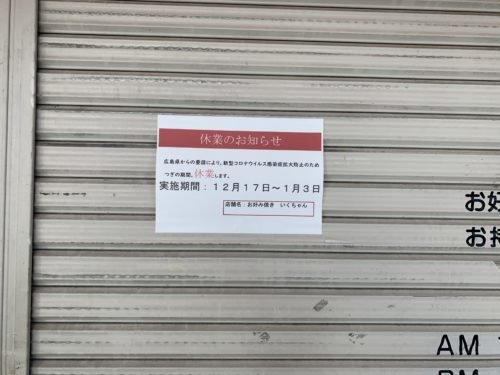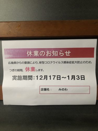 本日12月17日から広島市内中心部をはじめとするかなりの地域の飲食店の一斉時短営業、または休業が始まっています。どちらのお店が休業で時短営業なのかはっきりしていませんが、かなりのお店が感染拡大防止に協力される予定だそうです。
