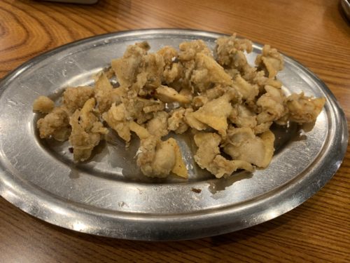 お店の方がお客様にきいてまわられます。ここであさりを頼まないと次に頼むことが難しくなります。なので頼まれることをおすすめします。あさりを頼むと、奥で御大が一気に揚げてくださいます。ジュワ~っとものすごい音がします!あさりを揚げ終わると先ほどまで使っていた油をすてて、新しい油にかえられるんです。常にフレッシュな油を使ってくださってるんですよ~!