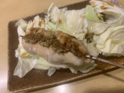 この日の最初はさびやきが登場しました!ささみってぱっさぱさってイメージが昔からありましたがみのわさんのささみを食べてからは考え方が180度かわりました!ジューシーでめっちゃ美味しい~!体にもいいですしね~!痩せようと思ったときはみのわさんのささみばっかり食べたらいいな~。ぇ