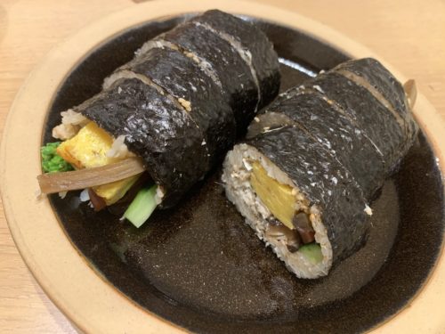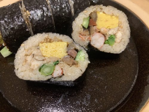 なかなかの大きさのごぼうが入った巻きずしは初めてです。ごぼうあいますね!アナゴもたっぷり入っています。でも穴子だけじゃないな~と思ってよ~く見てみると、、、あら!車海老がはいっています。すごっ!