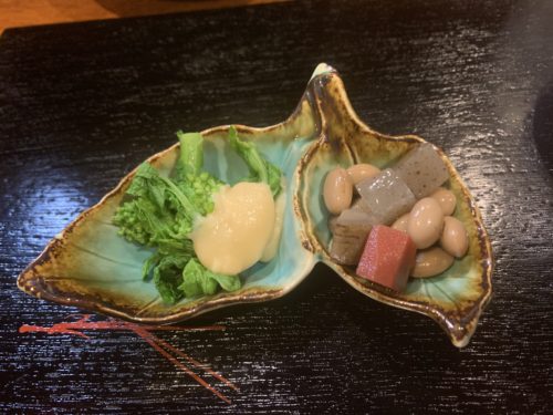 続いて菜の花と根菜と豆をいただきます。菜の花と酢味噌のバランスがいいですね~!春を感じます!