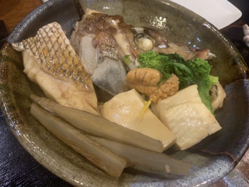 そろそろお腹もいっぱいになってきたのでと思っていると、鯛のあら炊きが登場しました!めちゃめちゃ大きな鯛でびっくり!お野菜もたっぷり入っています!