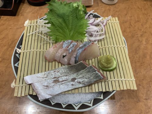 うどん定食が出来上がるまでお父さんとお話を楽しみます。この日はシマアジがばっちぐ~ということでシマアジのお刺身をお願いしました!