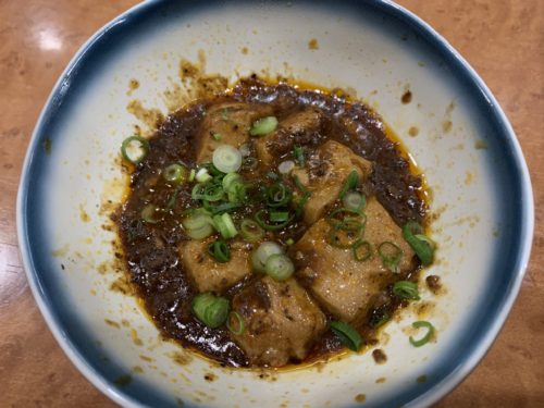 そこにいい出汁の香りとともにうどん定食が登場しました!一品はこの日は麻婆豆腐でした!麻婆豆腐も最近食べてないな~。いただいてみると、美味しい~!中華料理屋さんじゃないからこそのこの美味しさ!最高!