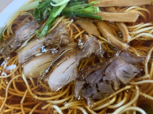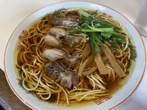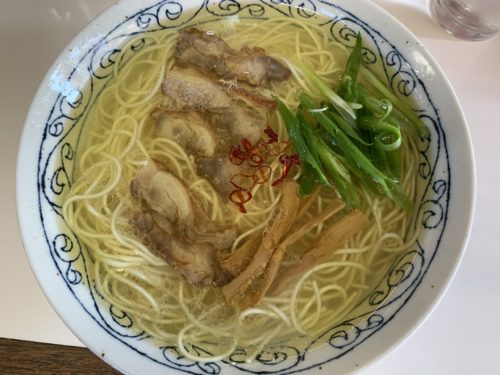 そこに一緒にいった方が頼まれた中華そばが登場しました!おおおおいしそう!しょうゆベースのスープですが、すんでいてとっても美味しそう!上にのっているのは鶏肉!鶏ガラベースのスープなのかな~と思いながら私の塩味を待ちます。