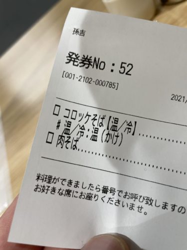 お店に入るとすぐのところに券売機があります。そちらで食券を購入!私は肉そばにしました!先輩は、、、まさかのコロッケそば!いやいや、まさかというかそもそもコロッケそばがなんであるの?