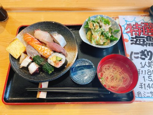 あれ?ちょっと待ってくださいよ、その下ににぎりランチが!1人前9貫ついて1180円のところなんと850円!まじですか!確かにそれは超お得!しかもミニサラダとお吸い物までついてくるって!