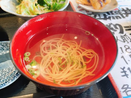 お吸い物には麺が少し入っていました!これだけで全然ちがいますね。一口いただくと、なんとも美味しい潮汁じゃないですか!