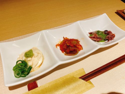 美味しい生ビールで乾杯させていただいて、先付はいつもの3種類!左から、豆乳と生クリームをくず粉で固めた豆腐、ふぐかわのキムチ、ホタルイカの大葉酢味噌和えです。