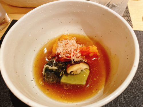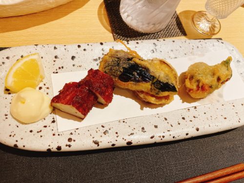 次は天ぷらが登場しました。地だこ、ナス、サツマイモ、さつま揚げです。このさつま揚げがこれまた一工夫してあってとっても美味しい~!癖になりそうです!