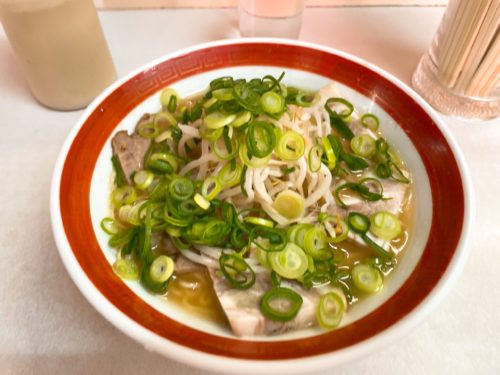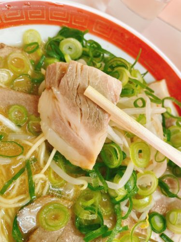 そして登場しました!チャーシュー麺!美味しそう!ねぎもたっぷり、チャーシューもたっぷり入っています!最高です!