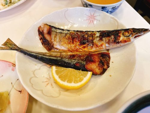 そうこうしていたら登場しました!さんまの塩焼きにほうれん草と卵!お漬物とごはんもついてきます。まずはごはんから!この炊き具合が私はすきなんですよね~!美味しい~!