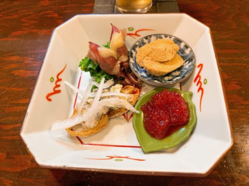 まずは先付から!すじこ、ホタルイカ、鯛の子、カナッペ!懐かしいな~この一皿!もちろんどれも美味しすぎる~!